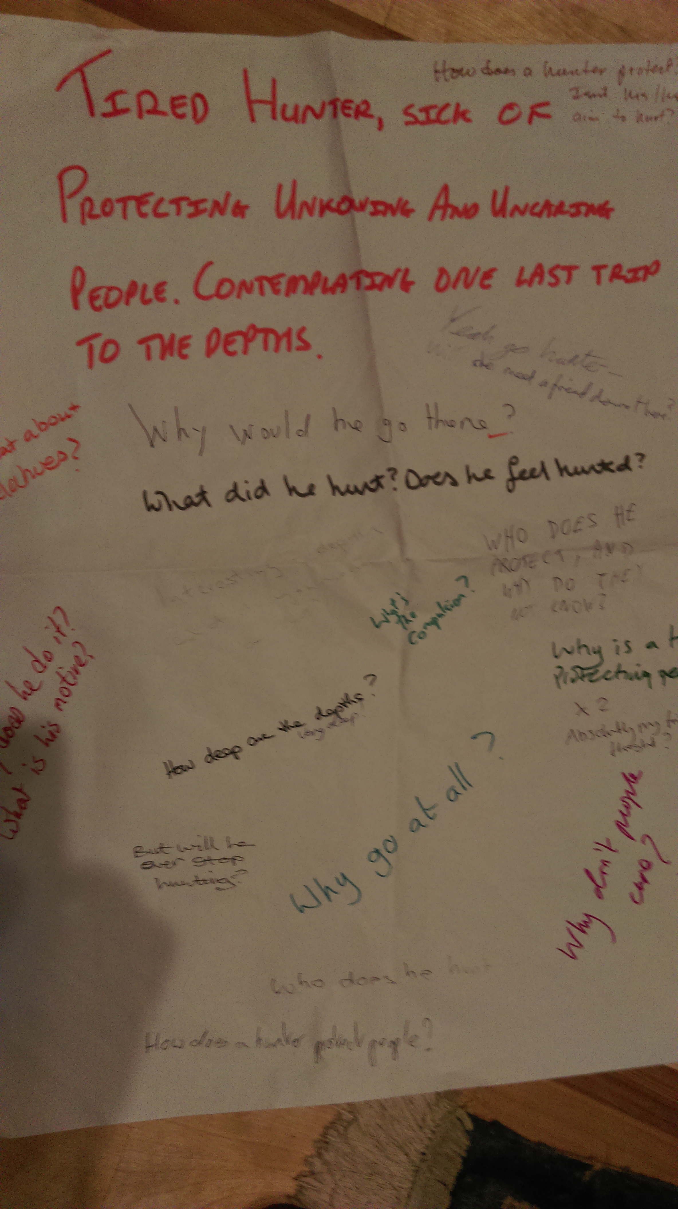 A really good one for groups to do - Everyone gets a sheet of A3 and writes a single sentence about their plot/character in the centre. The sheets are then pinned up around the room and everyone is given half an hour to wander round the sheets and add questions to the sheets.
